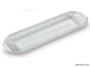 Por otro lado, tenemos unas bandejas rectangulares de plástico translúcidas con un diseño fino y elegante que sirven sobretodo para presentar y servir aperitivos, postres, brazos de gitano, etc. Tiene una medida de 46 cm x 15 cm x 3 cm.
